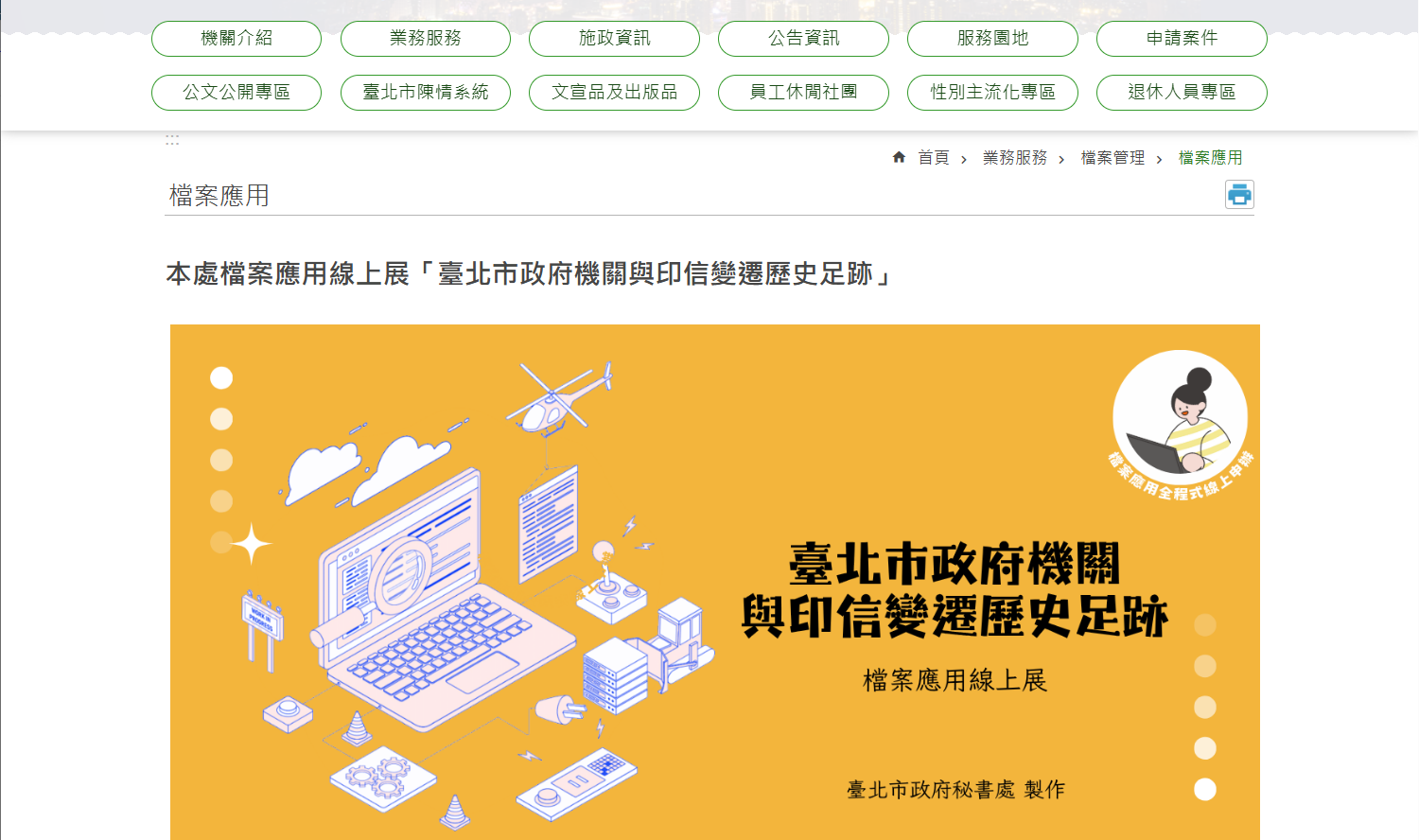 本次線上展覽以「臺北市政府機關與印信變遷歷史足跡」為主題。秘書處為臺北市政府印信的典守機關,負責印信之管理、保管與換發等業務,相關紀錄亦成為本處極具代表性的特色檔案。